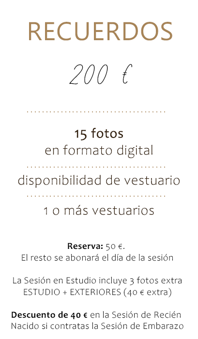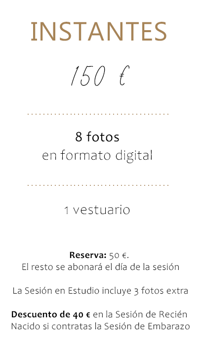 Si contratas a la vez la sesión de Embarazo y Recién Nacido, se te aplicará un descuento de 30€, que se hace efectivo en tu sesión de recién nacido.
